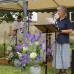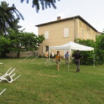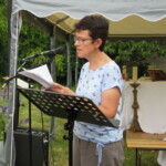 Puis nous nous tournons vers Marie : « Si le vent des tentations s’élève… regarde l’étoile » et c’est justement le moment ou le vent se lève concrètement ! Après la photo de groupe, c’est le temps d’apéro, occasion de nous retrouver, de faire ou refaire connaissance, puis on passe à table. C’est au café que les choses se gâtent : il est 13h30, et le ciel tombe sur nous, toutes les vannes sont ouvertes et nous sommes trempés. meteoagricole ne nous avait pas trompé…