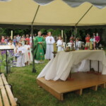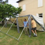 Dès 8h00 du matin, les plus courageux (et comme souvent, les plus discrets) étaient là : après la préparation des tables et des chaises la veille, il fallait monter les tentes. Le curé a le nez collé à son téléphone : quel est le temps prévu ?! météo agricole nous garantit un temps sec jusqu’à 13h00… En avant ! dernier mail de relance pour inviter ceux qui hésiteraient à cause du temps…