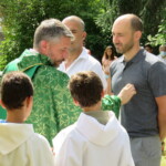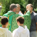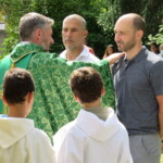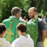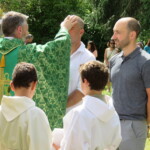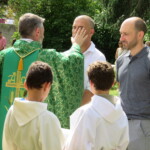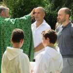 Olivier et Godefroy accompagnent ces 2 hommes au nom de toutes notre communauté. Puis le prêtre signe le front, puis les oreilles, puis les yeux, puis le cœur et enfin les épaules des catéchumènes : Qu’ils appartiennent tout entier au Christ !